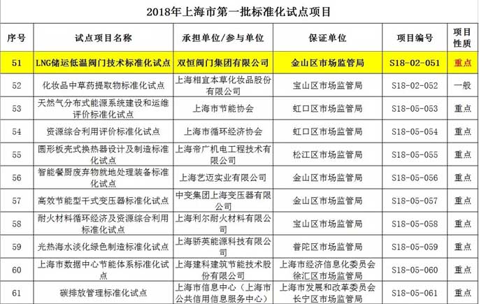 我司LNG低溫閥門技術(shù)被列為上海市第一批標準化試點重點項目!